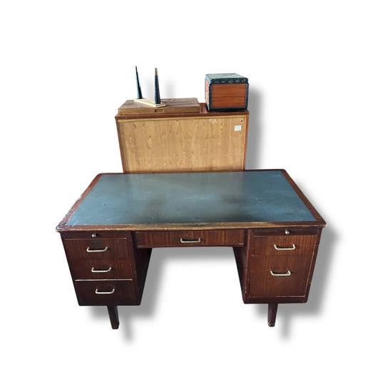 Mid Century Modern Leather-Top Wood Office Desk | Vintage Executive Desk with Sliding Inserts