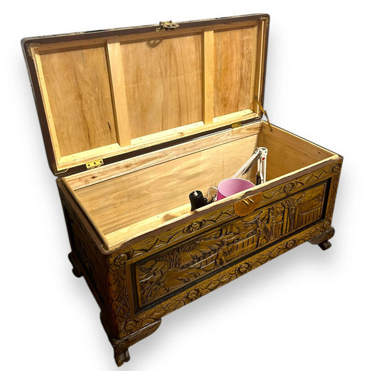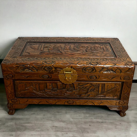 Antique Oriental Carved Camphor Wood Trunk Chest