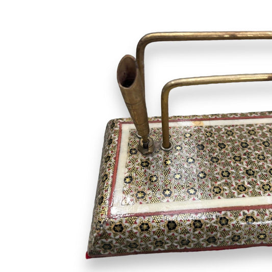 Antique Persian Khatam marquetry wood and gold tone metal inlay desk writing set