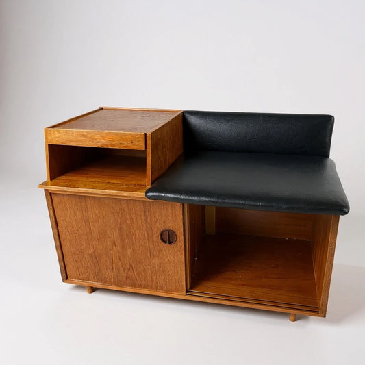 Vintage 1960s Chippy Heath Teak Telephone Table – Mid-Century Modern Hall Seat with Black Vinyl