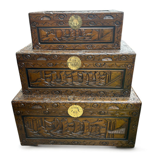 Vintage Chinese carved Camphor wood set of three stacking chests