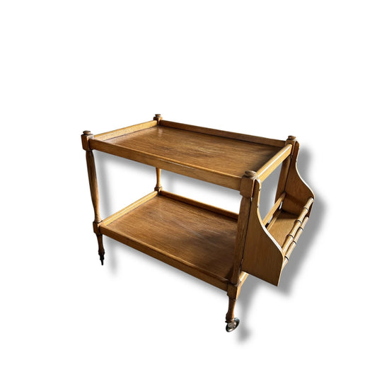 Vintage Oak Drinks Trolley with Bamboo Detail & Magazine Rack – Mid Century Bar Cart