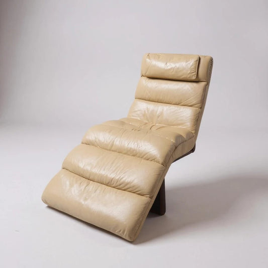 Mid Century Beige Leather Chaise Lounge Chair | Vintage Retro Lounge Chair with Wood Legs