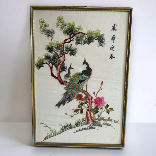 Vintage 1970s Chinese Silk Peacock Framed Tapestry