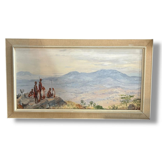Mid Century Kenyan Maasai Warriors Landscape Framed Painting