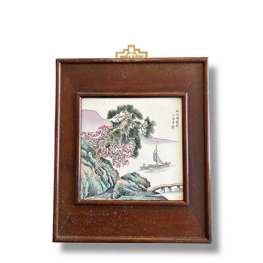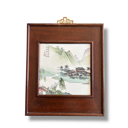 Vintage Chinese Hand-Painted Porcelain Tile Plaque in Rosewood Frame – Scenic Landscape Wall Art