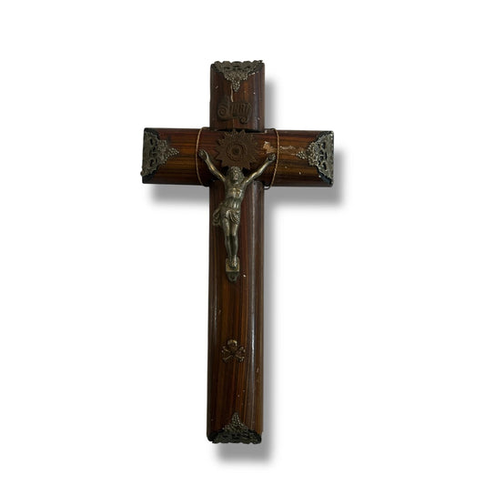 Vintage 1960s Wooden Marquetry Jesus Christ Crucifix