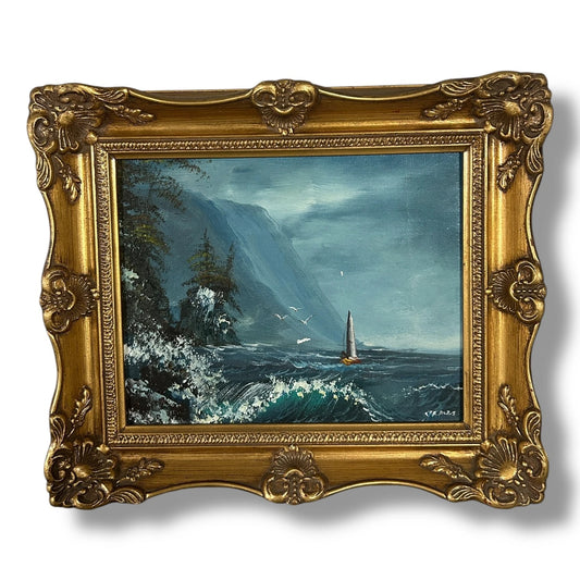 Vintage 1970s Nautical Landscape Oil Painting with a Gilt Frame