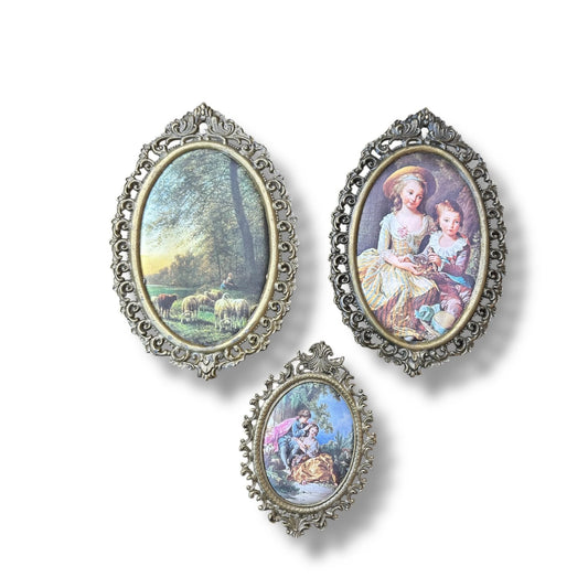 Vintage 1970s Victorian Silk Art Trio in Rococo Gilt Frames | Set of 3 Ornate Silk Textiles