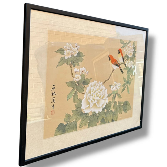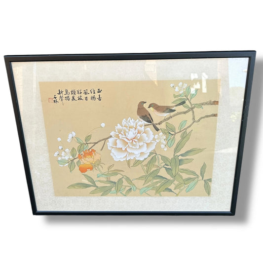 Vintage 1960s Chinese Birds Nature Floral Silk Art Framed Painting