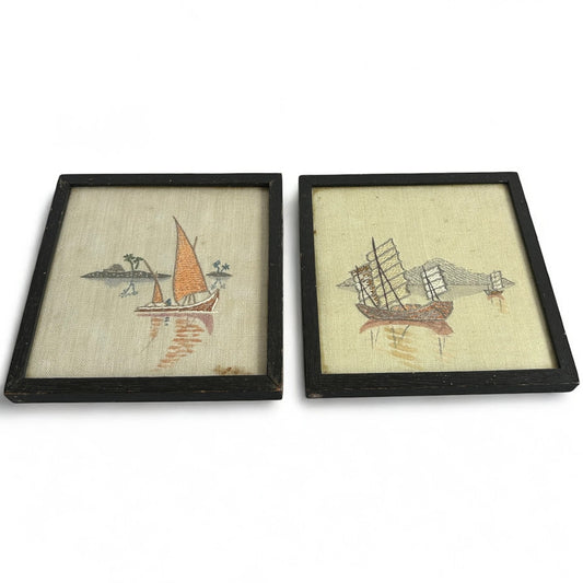 Mid Century Japanese Boats Handpainted Silk Paintings