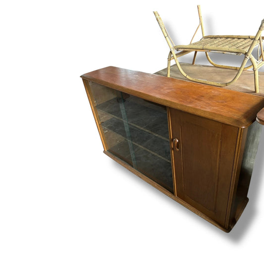 Midcentury Solid Oak Bookcase with Sliding Glass Doors | 1960s Priory Cabinet, Ercol Style