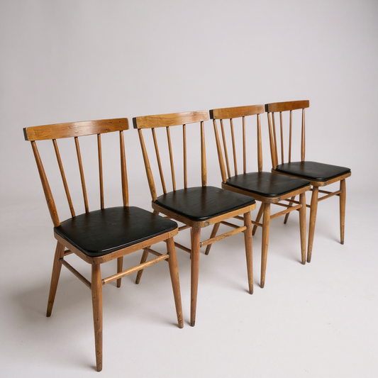 Set of 4 Vintage Stick Back Dining Chairs | Mid-Century Kitchen Chairs with Black Vinyl Seats