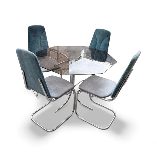Vintage Chrome & Glass Hexagonal Dining Set | 1970s Space Age Table + 4 Blue Velvet Chairs