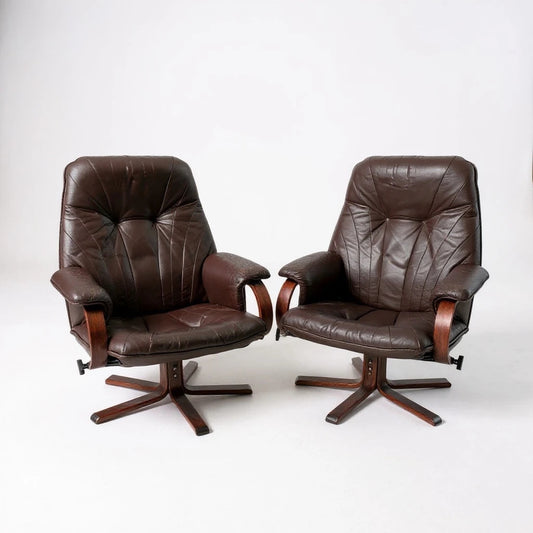 Pair of Vintage Brown Leather Reclining Swivel Armchairs – Danish Stressless Style Chairs