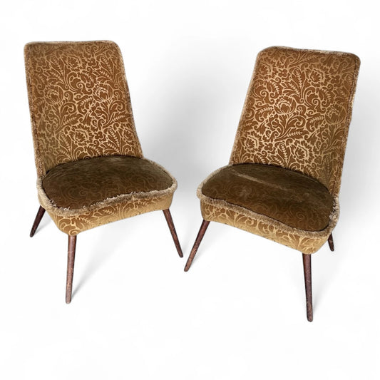 Pair of Mid-Century Cocktail Chairs | Gold Brocade Upholstery with Tapered Legs