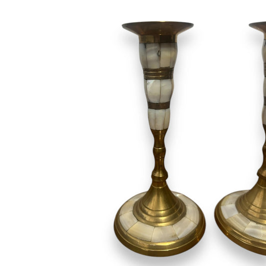 Vintage 1950s Pair of Brass and Mother of Pearl Candlestick Holders