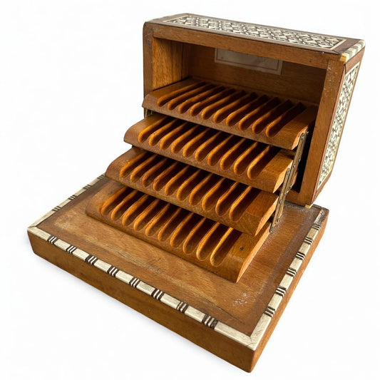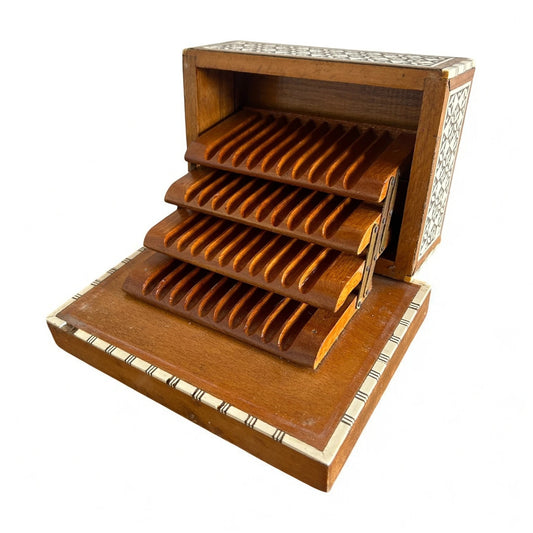 Mid Century Modern Mother of Pearl Mosaic Carved Wood Musical Cigarette Dispenser Box