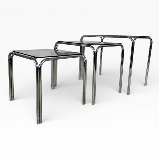 Mid Century Smoked Glass & Tubular Chrome Nest of Tables