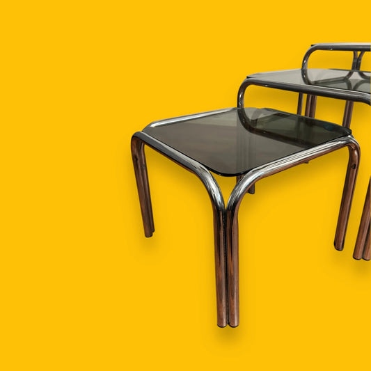 Mid Century Smoked Glass and Chrome Nest of Tables