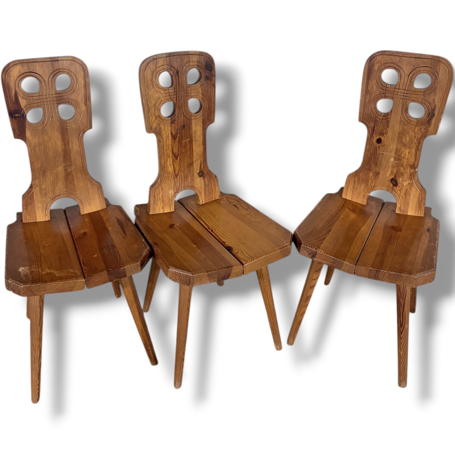 - Vintage dining chairs exhibiting authentic European folk furniture craftsmanship