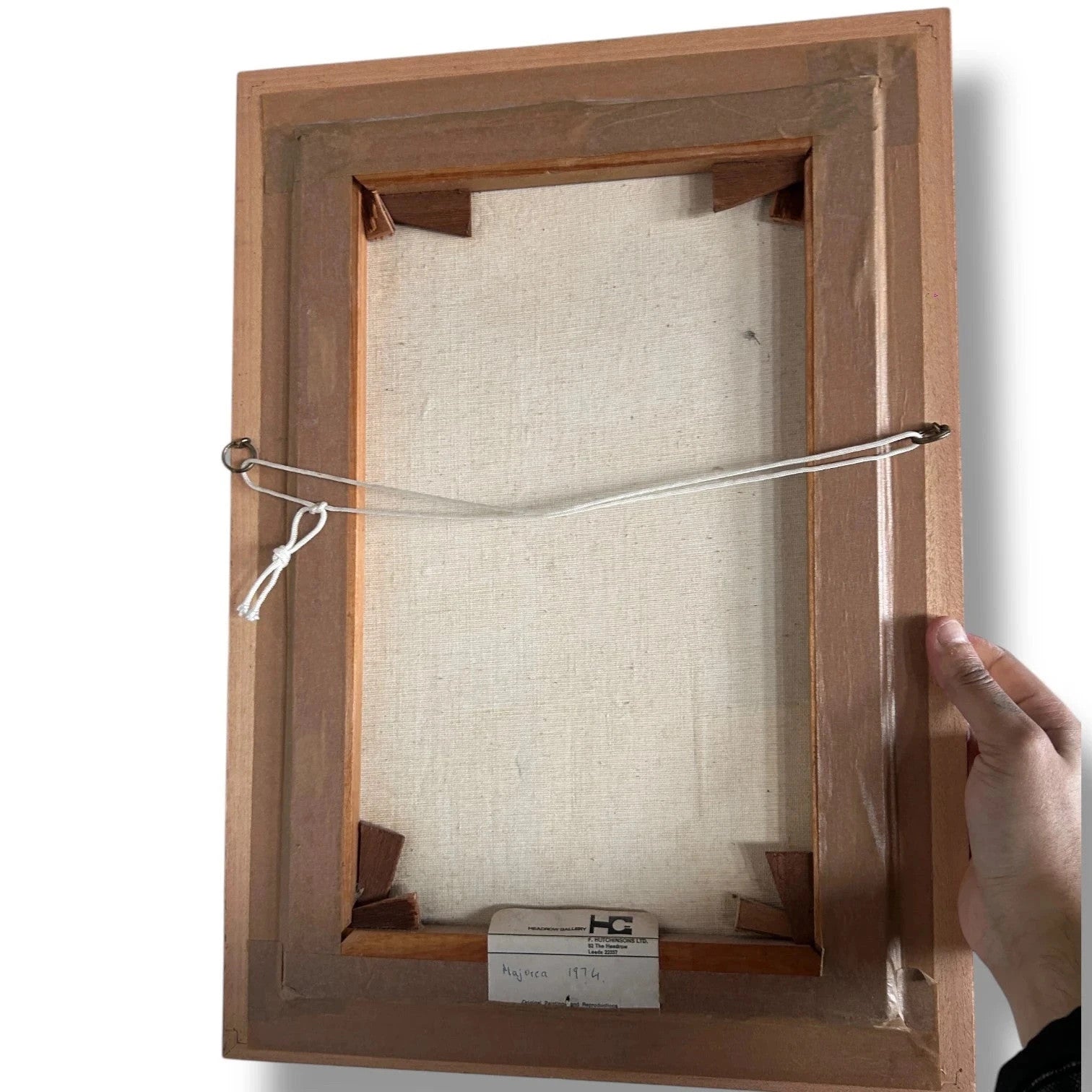 charming vintage oil painting on canvas, dated 1974, depicting a sunlit Mediterranean street leading to a vivid blue harbour. Executed with lively, impasto brushwork and rich, warm tones, the piece captures the essence of mid-century European landscape painting — textured walls, green shutters, bright sea, and distant sailboats. Signed lower right and presented in its original silvered wood frame, this painting exudes an effortless warmth and nostalgia reminiscent of 1970s travel art. Details • Date: 1974 • Artist: Signed (illegibly, lower right — possibly Haynesa) • Medium: Oil on canvas • Origin: UK gallery provenance — “HG Framing Galleries, Nottingham” label verso • Condition: Excellent vintage condition with light age-related wear to frame edges. Dimensions • Frame: 49 cm × 33 cm • Canvas: 40 cm × 24 cm Features • Signed and dated 1974 • Mediterranean coastal view • Original silvered wooden frame • Textured oil impasto technique • Ready to hang Delivery & Collection • UK delivery available – please enquire for a quote. • Collection welcome from West Yorkshire. • More available at variusvintage