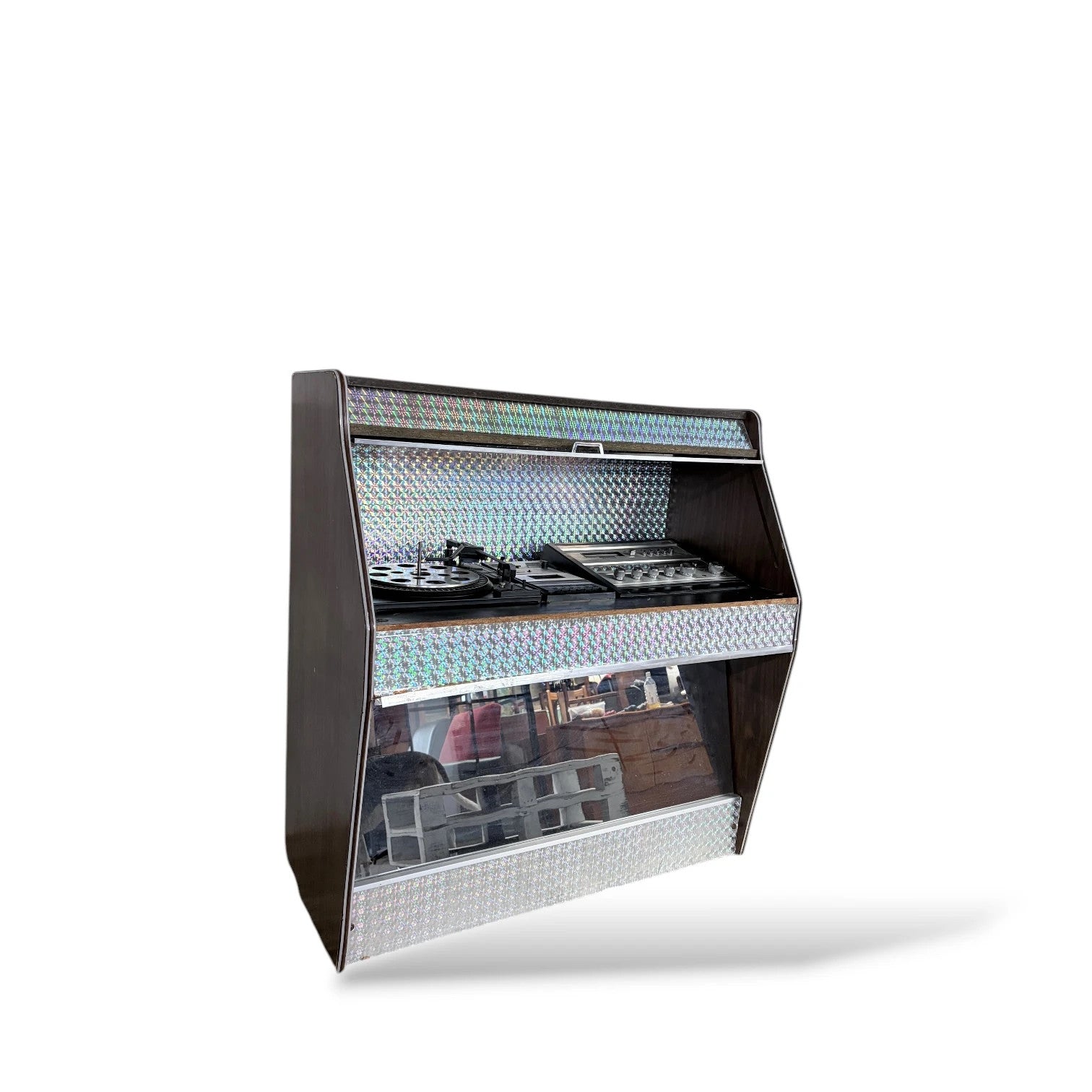 A dazzling 1970s Stereophonic music centre jukebox cabinet, straight from the age of chrome, disco, and vinyl. This sculptural cabinet combines mirrored acrylic panels with holographic detailing for a distinctly futuristic finish. The unit houses a record player, radio tuner, and cassette deck, all set within a dark wood-veneer frame — a stunning example of space-age design meeting domestic entertainment. The mirrored surfaces and prismatic pattern catch the light beautifully, creating a bold centrepiece for any retro-inspired room or vintage audio setup. (Note: sold as a decorative piece – electrical components untested) Details • Period: 1970s • Origin: United Kingdom • Materials: Wood veneer, mirrored acrylic, chrome trim, holographic panels • Condition: Good vintage condition with light wear and patina; electronics untested Dimensions • Width: 96 cm • Height: 102 cm • Depth: 48 cm Features • Mirrored front and sides with holographic detail • Built-in record player, tuner, and cassette deck • Distinctive angled body and space-age aesthetic • Ideal as a display, prop, or statement furniture piece Delivery & Collection • UK delivery available – please enquire for a quote • Collection welcome from West Yorkshire • See more at variusvintage
