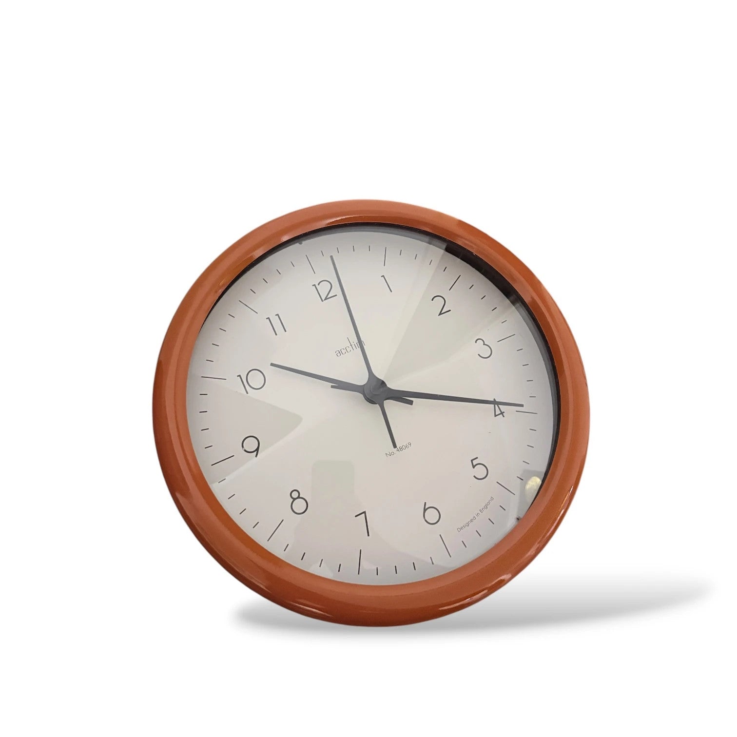 Stylish mid-century modern wall clock by Acctim, featuring a burnt orange enamel frame, clean white face, and minimalist black numerals and hands.