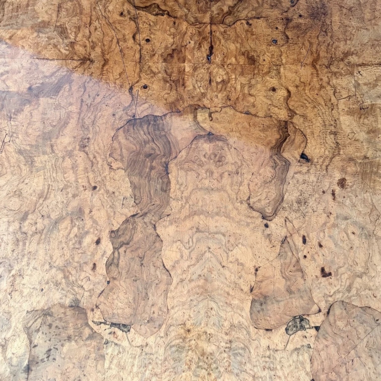 * Original antique British dining room table crafted from burr walnut veneer