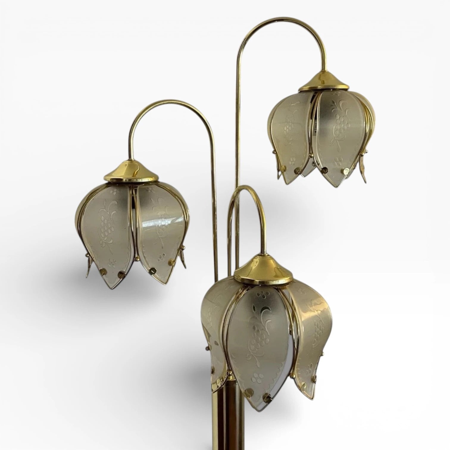 This sculptural glass shades lamp works beautifully beside sofas or armchairs, elevating mid-century lighting setups or adding flair to eclectic spaces. Its etched glass petals diffuse light evenly, creating a warm atmosphere without harsh glare. The original vintage character includes minor age-related wear and patina on the brass, underscoring its authenticity and charm. Whether placed in an entryway or bedroom, this statement corner lamp transforms your room into a stylish retreat.