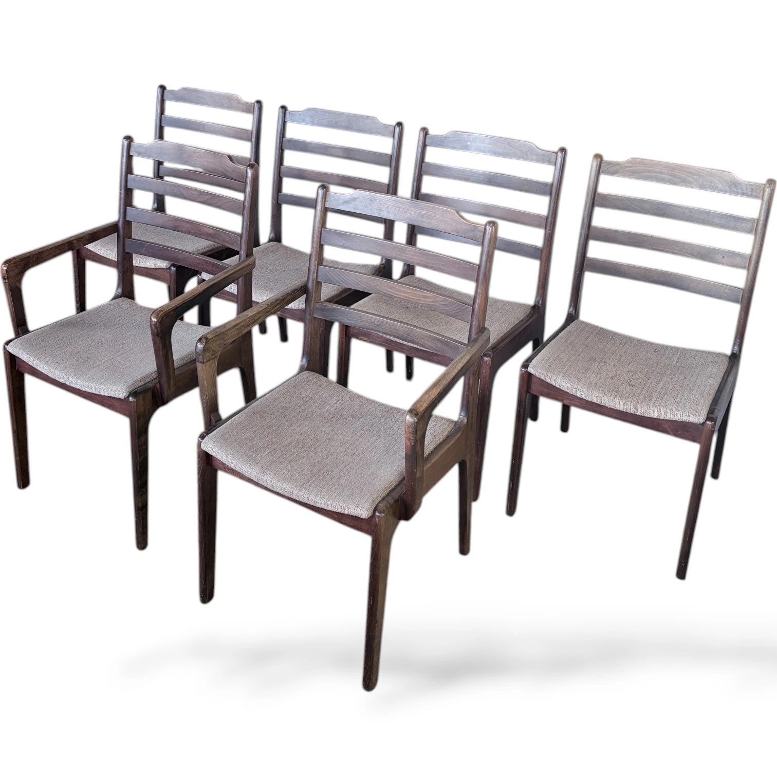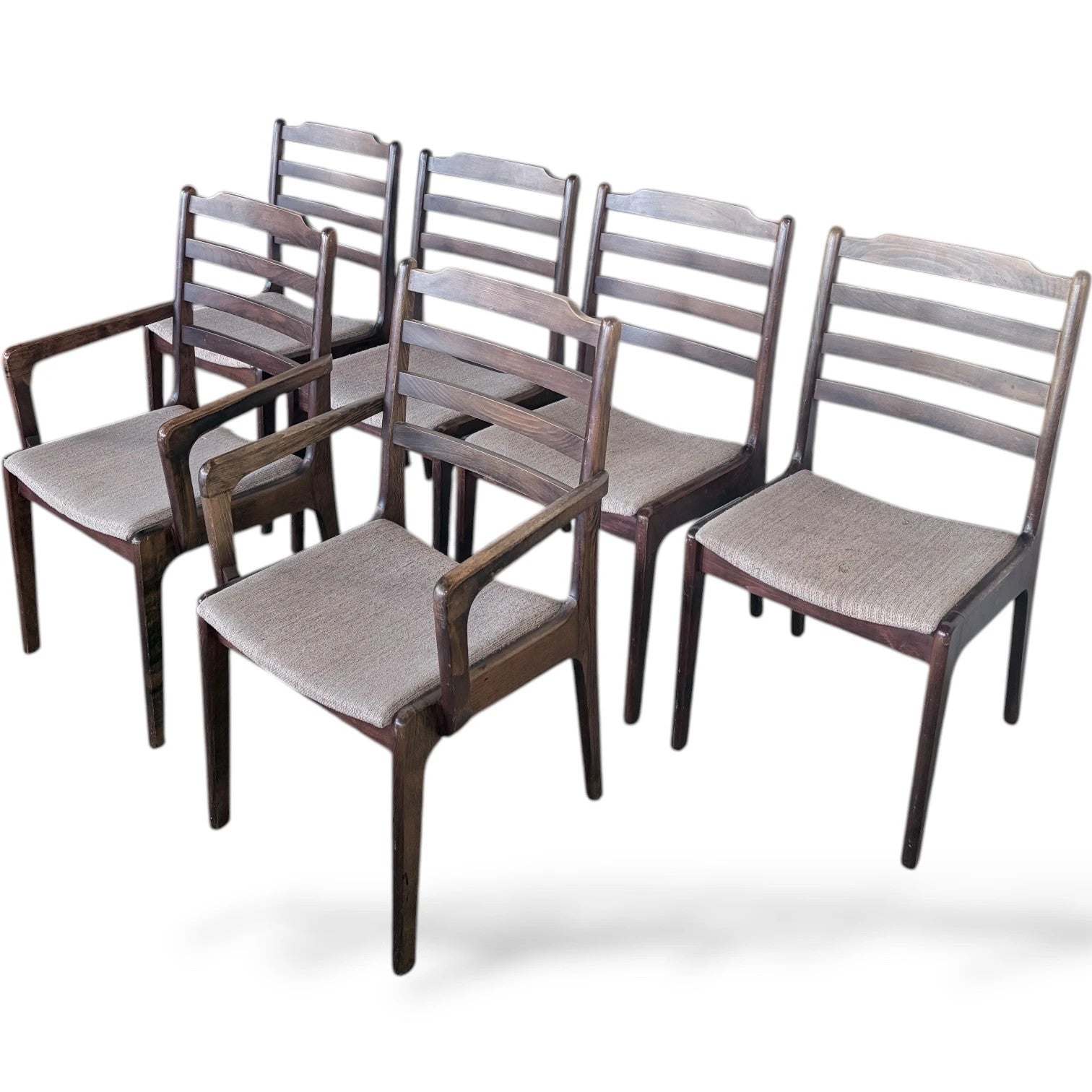 This set of rosewood dining chairs offers a perfect blend of mid century charm and Scandinavian design, delivering comfortable dining seating that enhances any kitchen or dining room. Crafted from solid wood, these vintage rosewood furniture pieces feature elegant ladder back chairs with neutral fabric seats, providing both style and support for long meals and gatherings. The set of six chairs includes two armrest dining chairs, adding versatility and comfort to your dining experience.