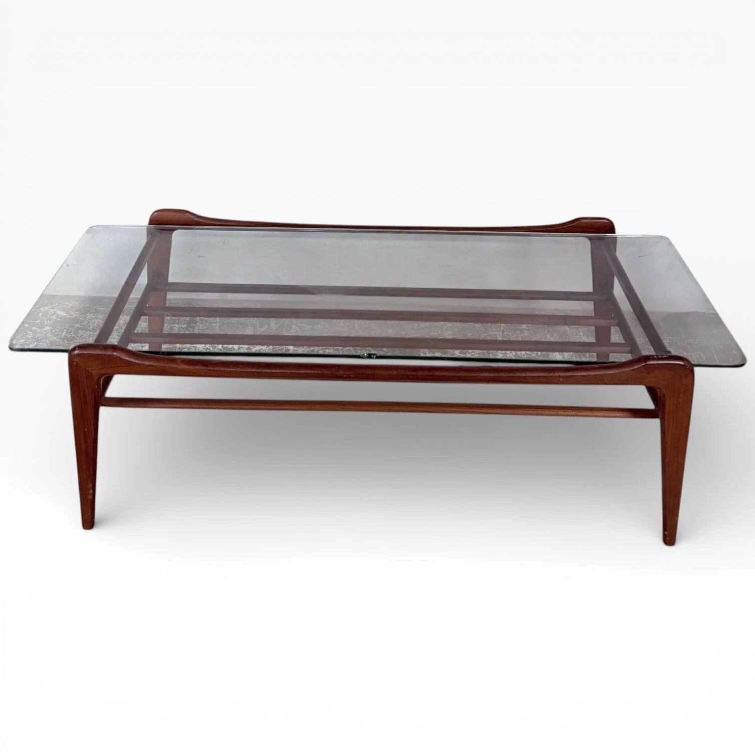 Bring home this exquisite mid century coffee table to enjoy the warmth of teak combined with the sleekness of a glass top table—an iconic piece that enhances any living area with authenticity and charm.