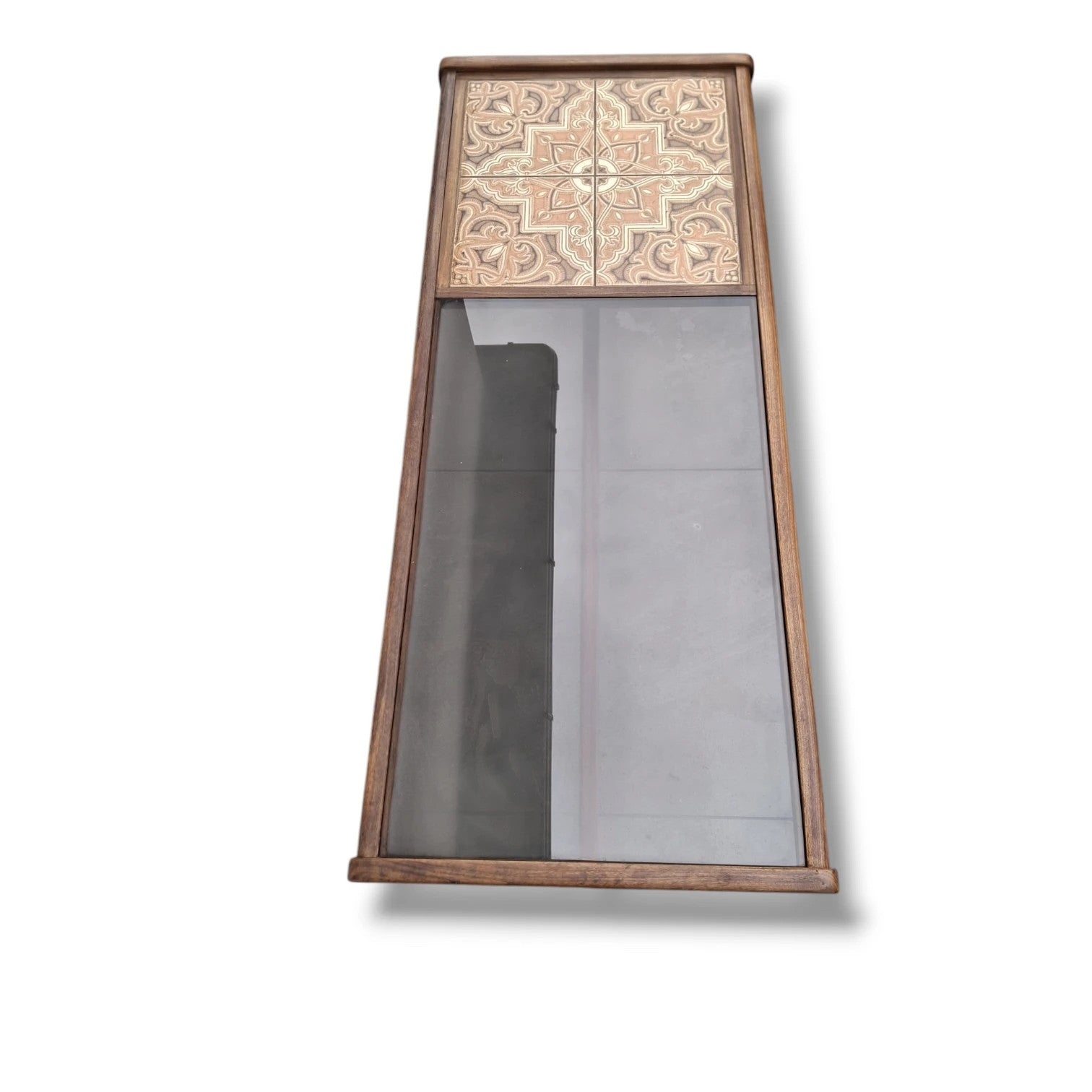 • Materials: Teak, smoked glass top, patterned ceramic tiles