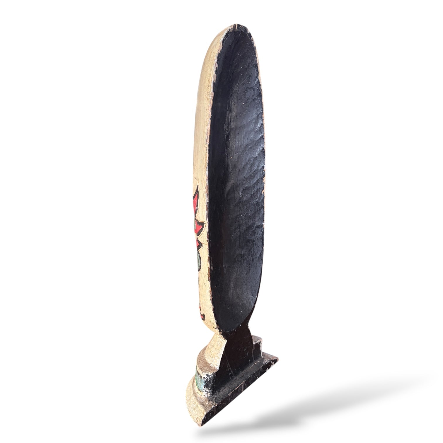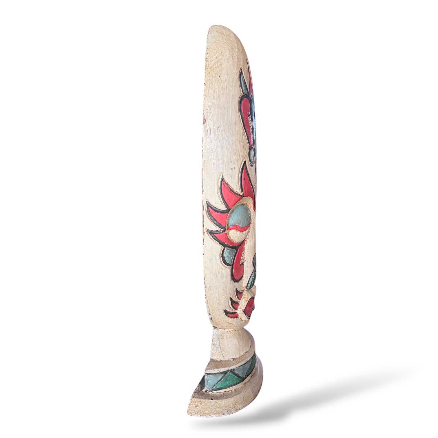 - Hand-carved wooden sculpture painted in red, green, and black pigments for vibrant visual impact