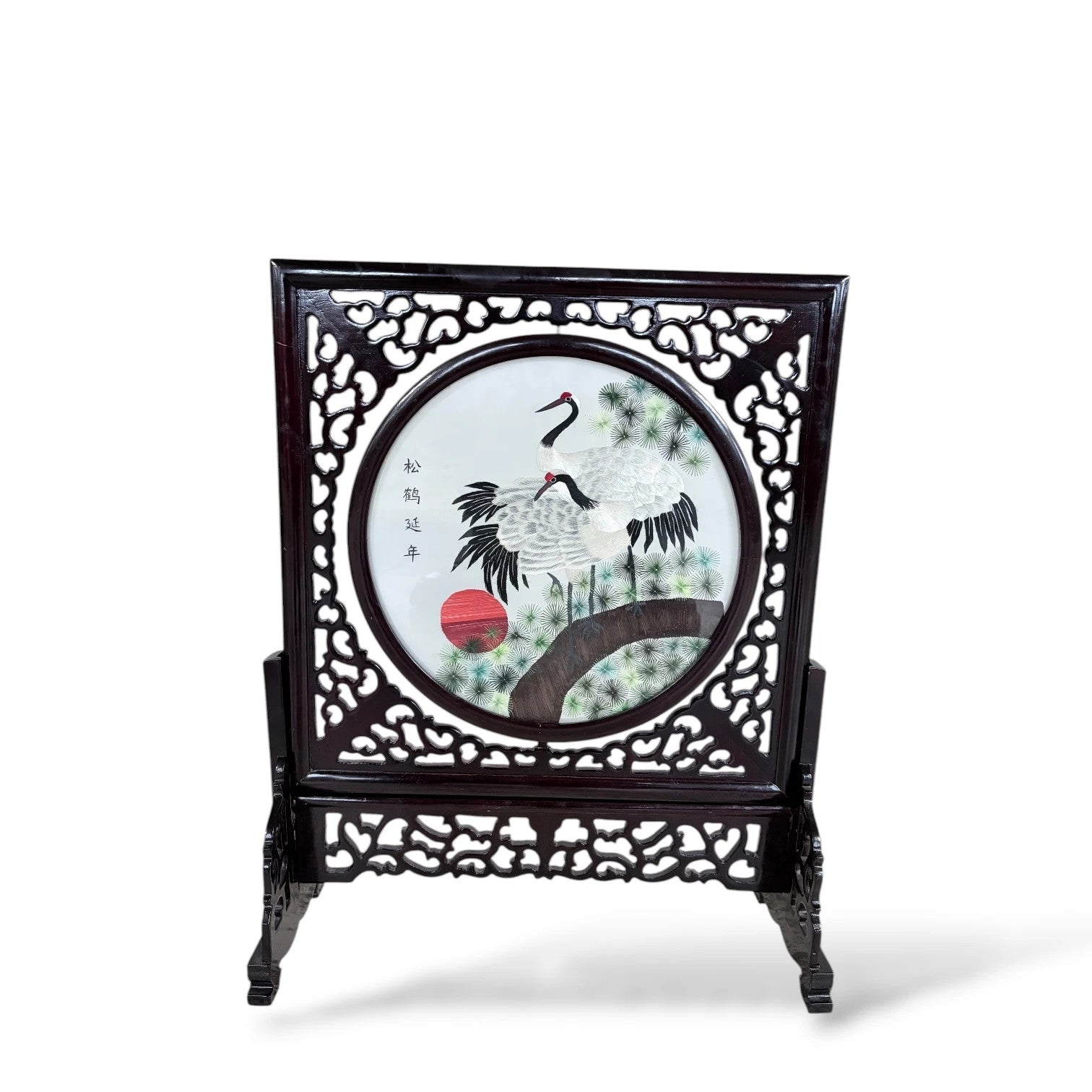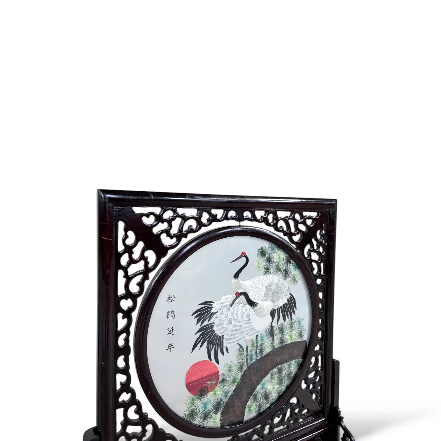 A beautiful Japanese embroidered silk panel featuring a pair of red-crowned cranes perched among pine branches beneath a red sun — traditional emblems of longevity and harmony in Japanese art. The delicate embroidery is executed on fine silk, housed in an elegant carved hardwood frame with intricate openwork panels. The frame is rotating / reversible, allowing light to pass through and enhance the texture of the silk threads — a hallmark of Japanese craftsmanship. A striking statement piece for collectors of Asian decorative arts, or for adding timeless elegance to a refined interior. Details • Origin: Japan • Date: c.1950s–1970s • Medium: Hand-embroidered silk on backing fabric • Frame: Dark carved hardwood, rotating within stand • Condition: Excellent vintage condition with minor surface wear. Dimensions • Height: 55 cm • Width: 40 cm • Depth: 18 cm (including stand) Features • Double-sided / rotating frame on stand • Intricate silk embroidery of cranes and sun • Traditional Japanese symbols of prosperity and peace • Elegant pierced woodwork frame • Display-ready