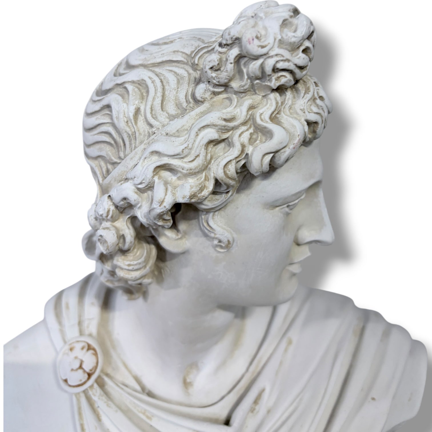 - Large plaster bust finished in soft white plaster with natural age-related wear