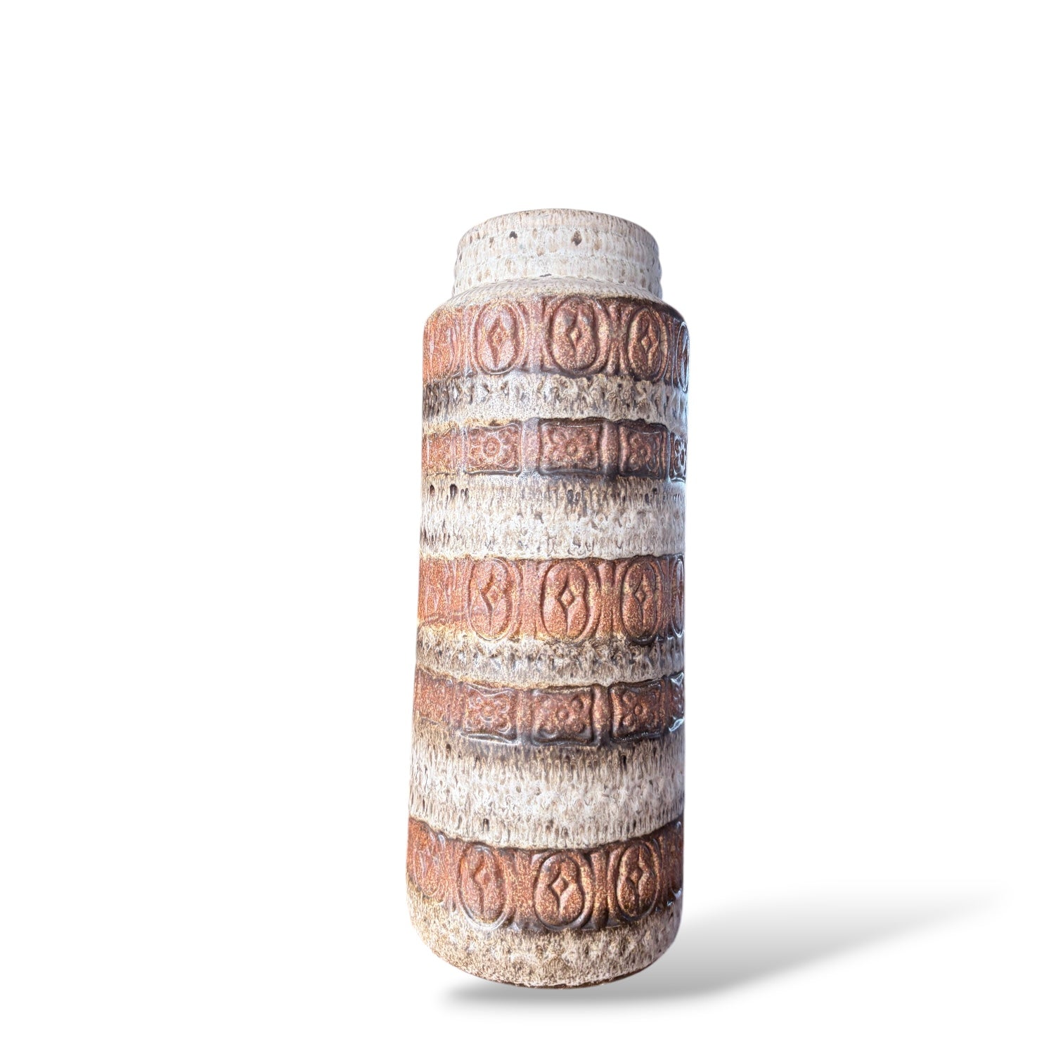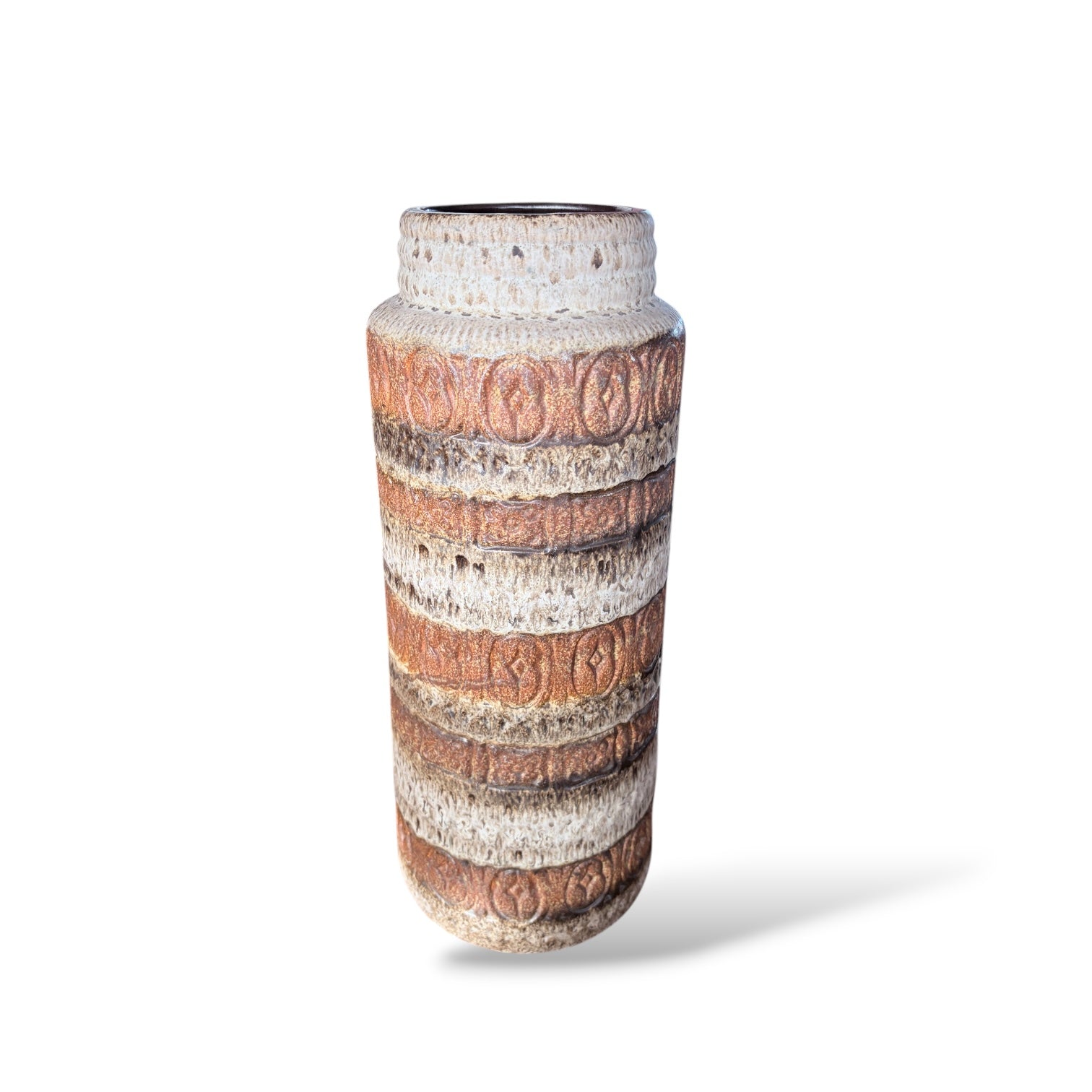 This West German pottery vase is a large fat lava vintage floor vase in brown cream tones, designed to bring sculptural ceramic decor and retro home decor charm to your space. Crafted in the 1970s, this textured ceramic vase features deeply textured horizontal bands and alternating earthy brown and cream glazes that highlight its repeating geometric motif. The west german pottery vase offers a tactile presence that enhances any room, delivering both style and substance as a statement floor vase or elegant display piece.