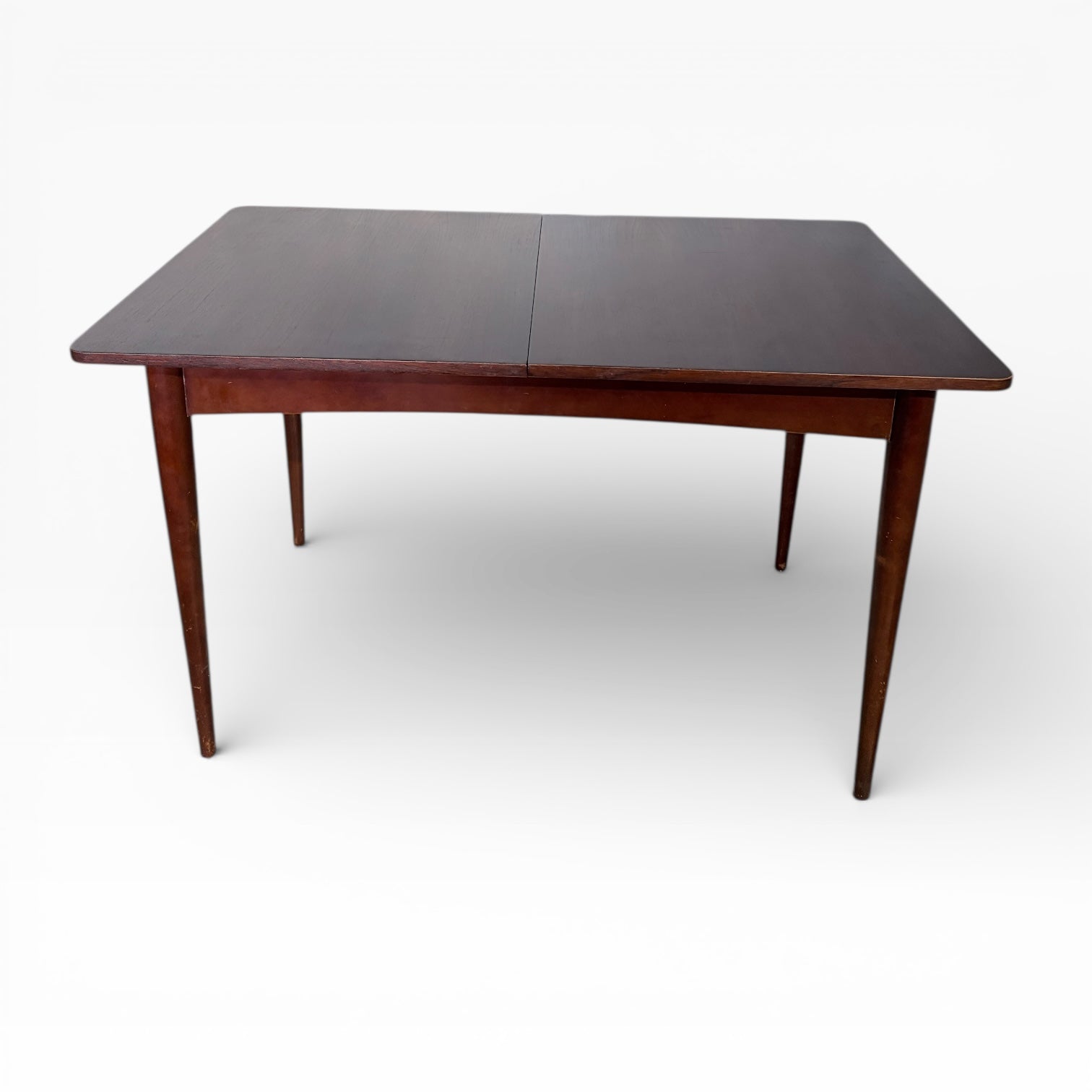 The vintage teak table showcases gently rounded corners and slim tapered legs, embodying Scandinavian style table aesthetics that enhance any interior with retro dining furniture charm. Its classic wooden table silhouette balances elegance and practicality, making it a space saving dining table ideal for both everyday use and special occasions. Tested for quality and durability, this piece arrives in good vintage condition with light age-related wear consistent with use, backed by positive customer feedback appreciating its timeless appeal.
