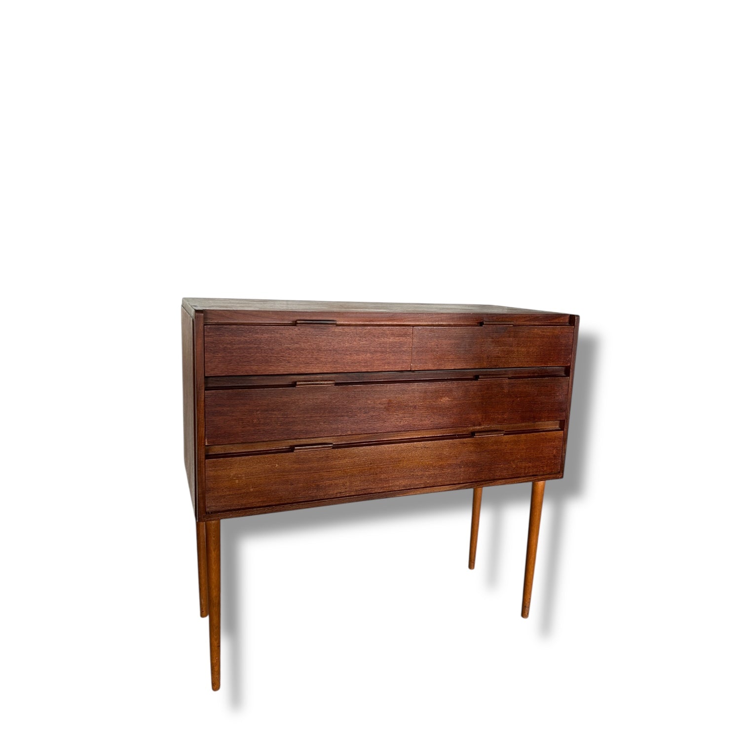 This narrow teak-veneer chest features four graduated drawers, including two smaller top drawers, designed to keep your essentials neatly stored while adding a touch of mid-century charm to any space.