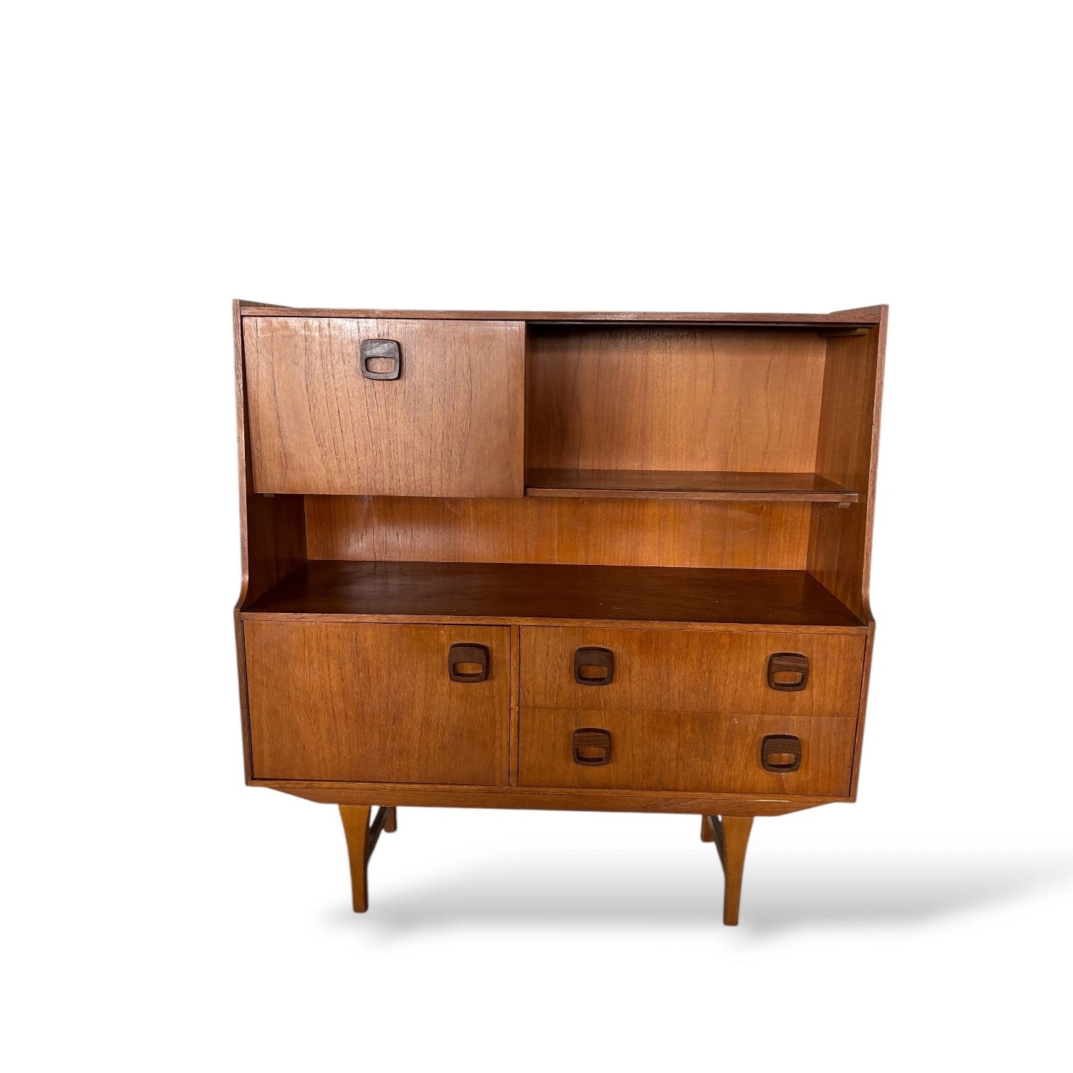 Mid Century Danish Highboard Cocktail Cabinet – Teak Sideboard Drinks Cabinet with Storage A striking mid century Danish highboard cocktail cabinet, crafted in the 1960s in warm teak veneer with distinctive sculpted square recessed handles. This elegant cabinet combines style and practicality: • Upper section with sliding doors and open display shelving – perfect for glassware or books. • Lower section with cupboards and drawers offering excellent storage. • Ideal for use as a cocktail bar, drinks cabinet, or living/dining storage piece. Its clean Scandinavian lines and elevated legs make it a timeless statement piece for both vintage-inspired and modern interiors. 📏 Dimensions: • Width: 120 cm • Depth: 41 cm • Height: 126 cm