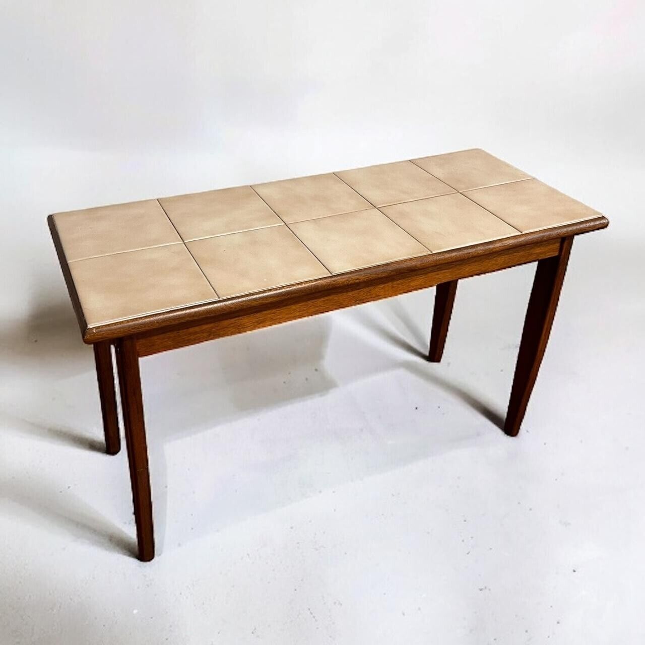lovely teak wood coffee table with danish ceramic tiles on the surface etched with in pastel pink