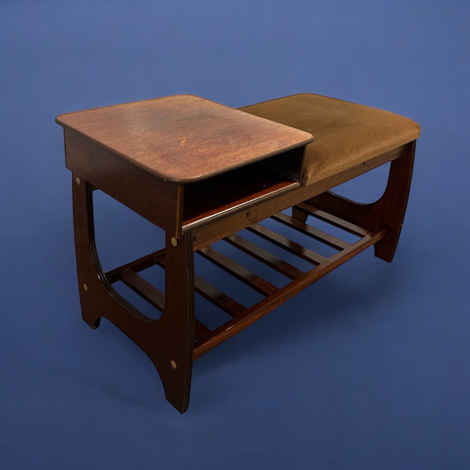 Expertly crafted from high-quality dark wood, this Mid Century Telephone Seat Table is the perfect addition to any modern or classic home. With its sleek and stylish design, it offers both functionality and style. Sit comfortably while using your telephone, or simply use it as an elegant side table.