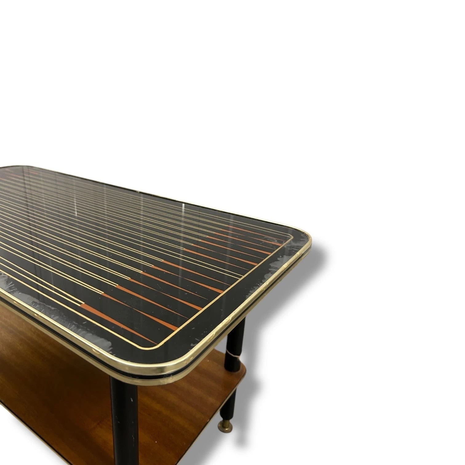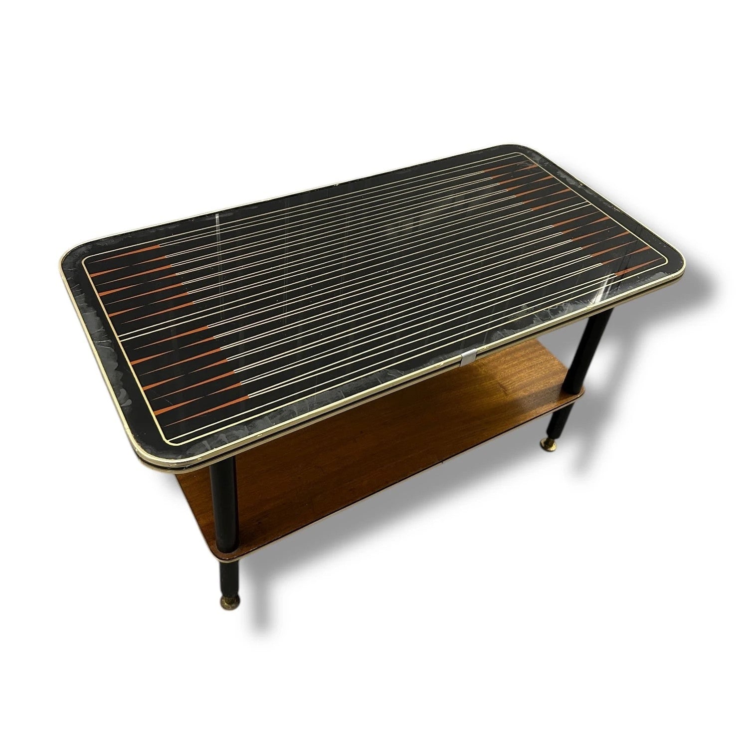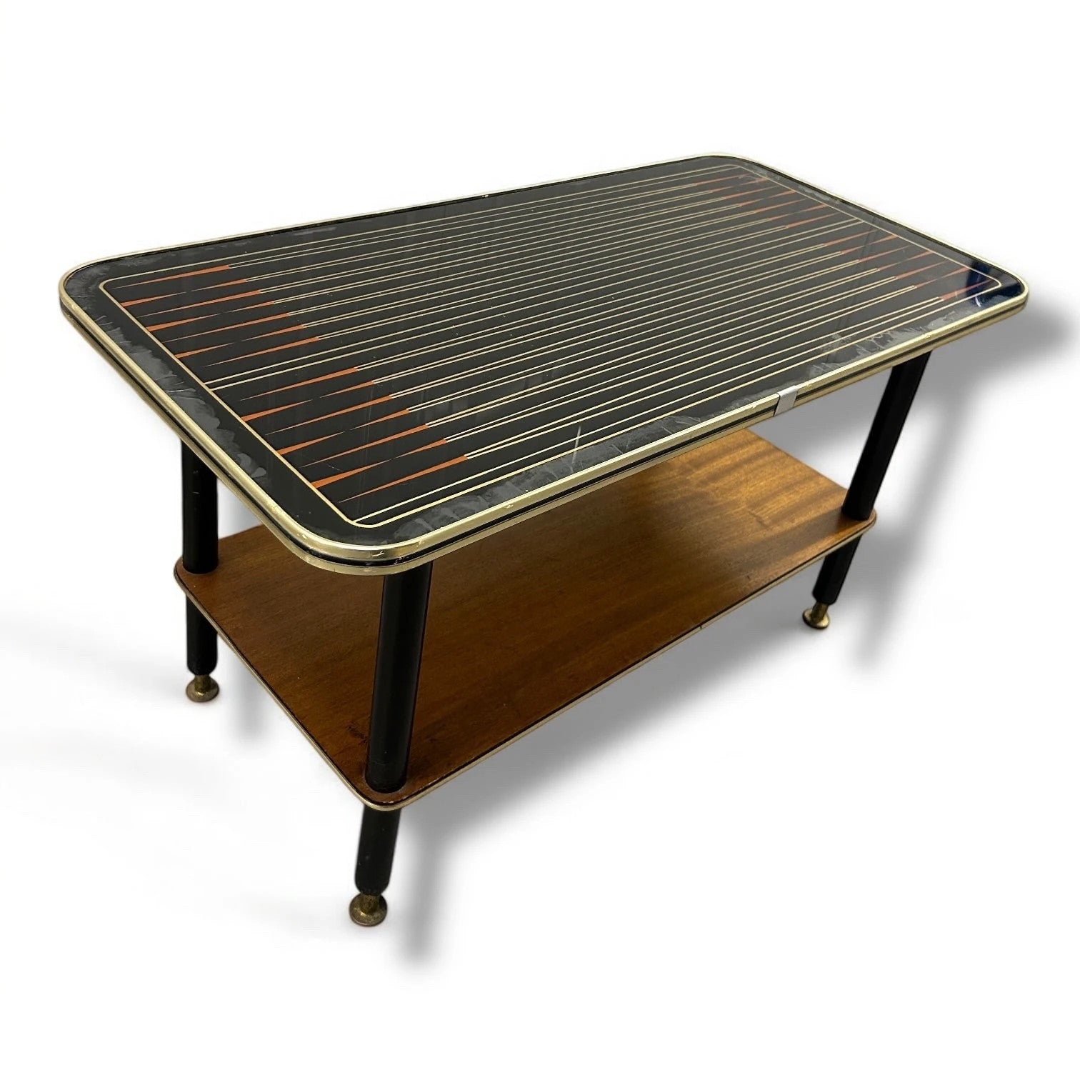 Bring a touch of mid-century charm to your living space with this striking 1960s Formica coffee table. Featuring a glossy black patterned Formica top with fine striped detailing, walnut-effect lower shelf, and sleek black tapered legs with brass feet, this piece is both functional and stylish. Perfect for retro interiors, eclectic living rooms, or vintage-inspired homes, it offers ample surface space while the lower shelf provides handy storage for books, magazines, or decor. ✨ Details: • Mid-century design, c.1960s • Black patterned Formica top with striped detail • Walnut-effect lower shelf • Brass-capped feet • Sturdy and practical 📏 Dimensions (approx.): Height: 45 cm Width: 75 cm Depth: 40 cm 💡 A versatile piece that works as a coffee table, side table, or accent table in modern and vintage interiors alike.