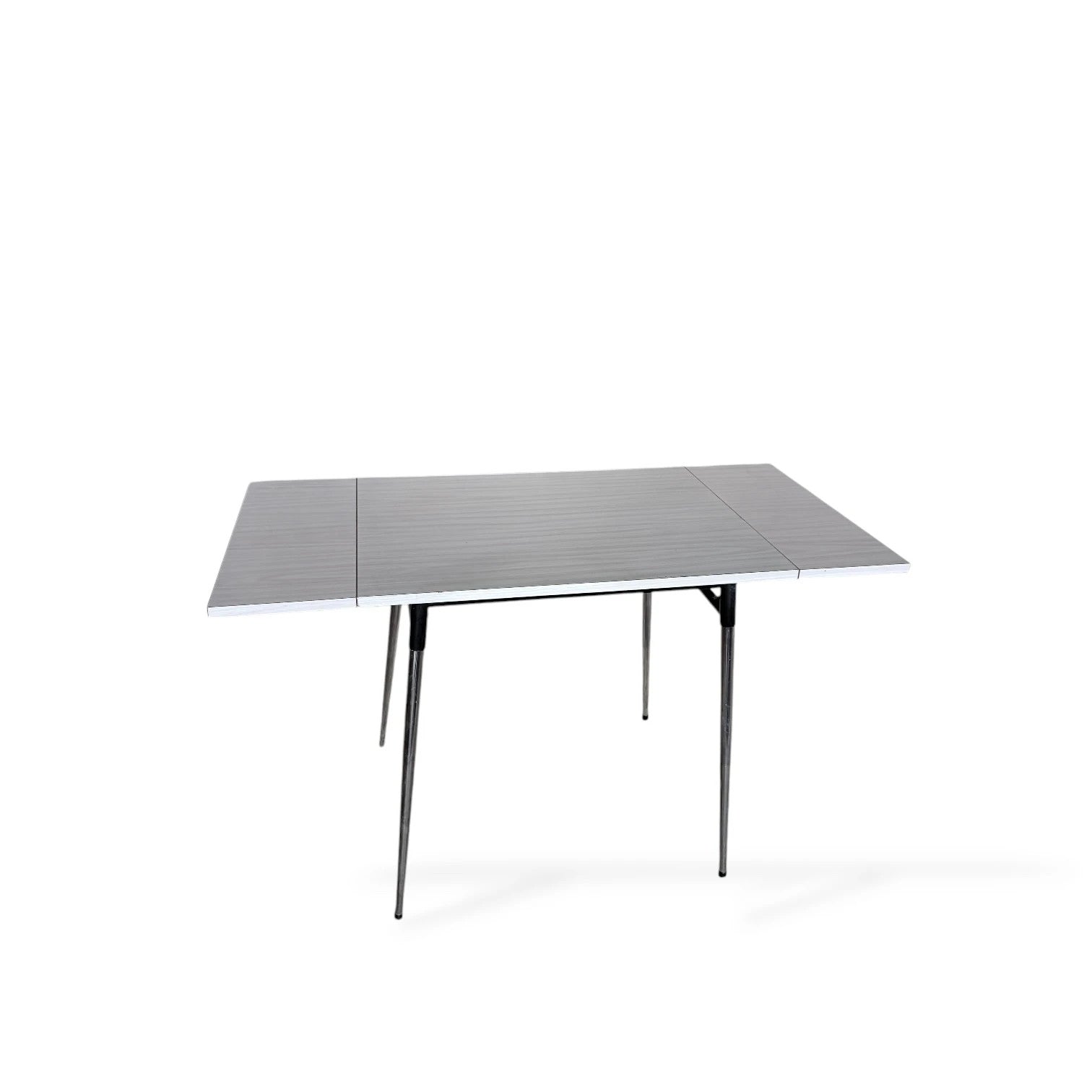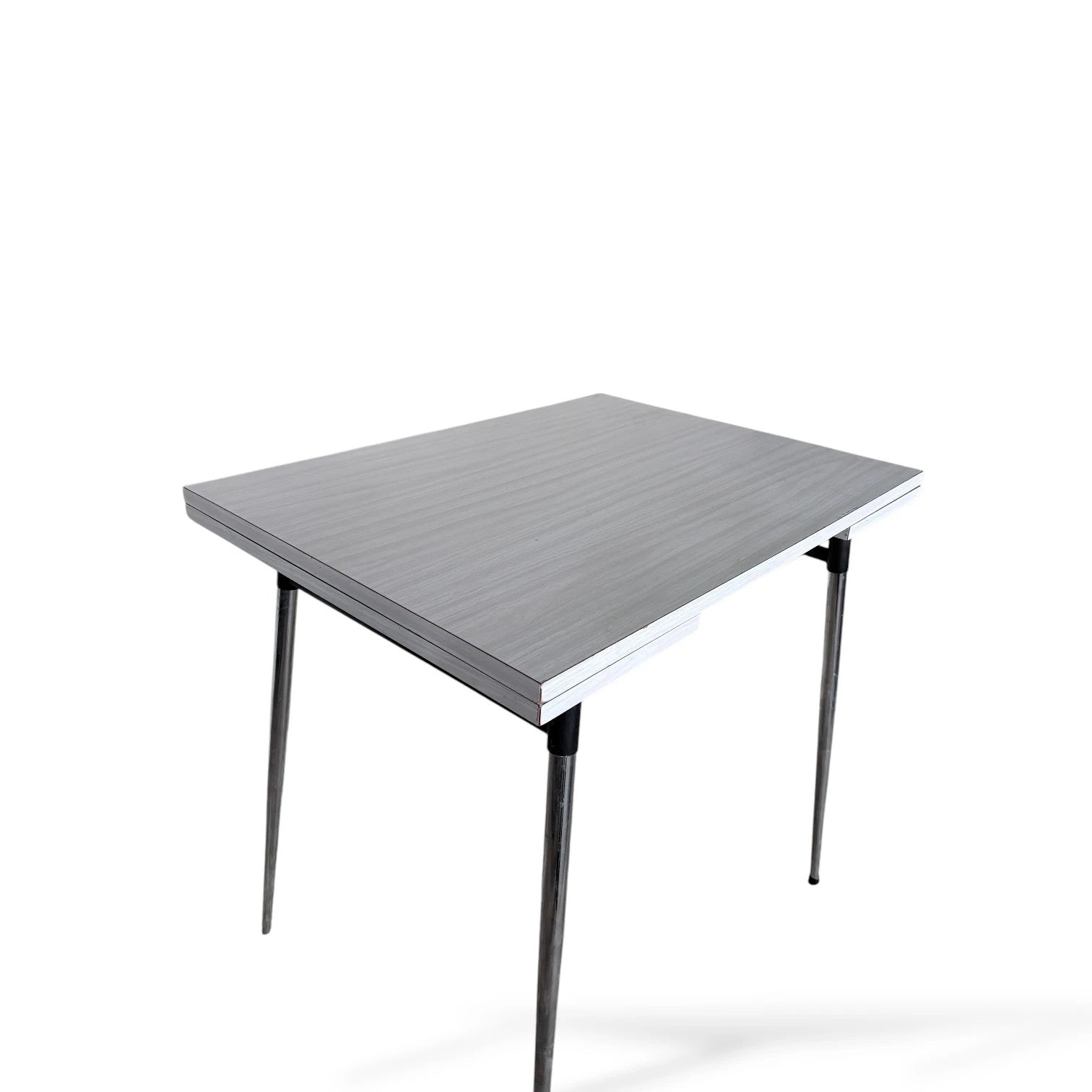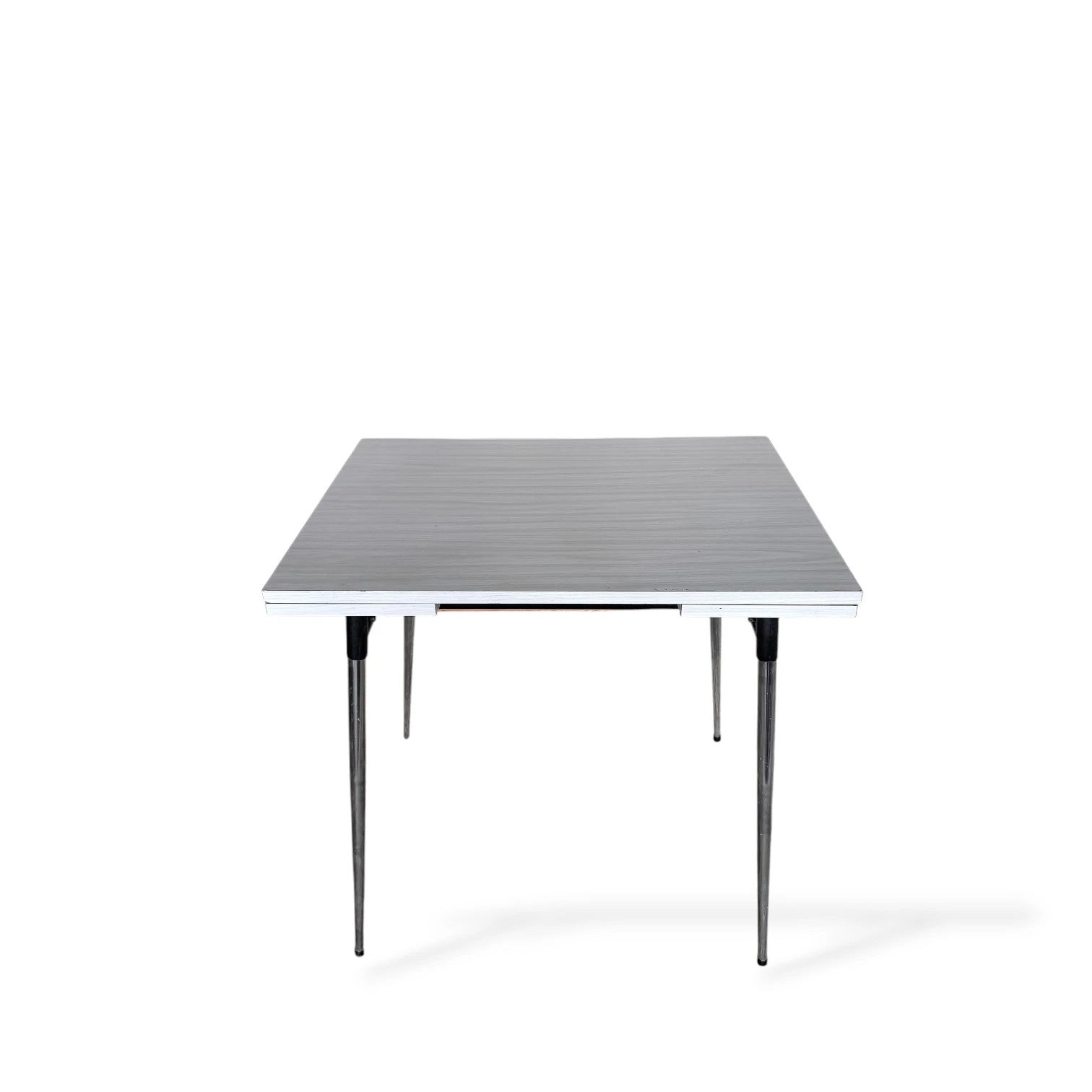 Mid-Century Formica Draw-Leaf Dining Table | Retro Kitchen Table with Chrome Legs A sleek mid-century Formica draw-leaf dining table, featuring a classic grey patterned top and slim tapered chrome legs. The table conveniently extends using its integrated draw-leaf mechanism — perfect for flexible dining and compact living spaces. The retro Formica surface is durable and easy to clean, making it ideal for daily use while keeping that authentic 1950s–60s modernist look. Dimensions: • Length (closed): 80 cm • Length (extended): 127 cm • Width: 60 cm • Height: 75 cm Excellent vintage condition with light signs of use.