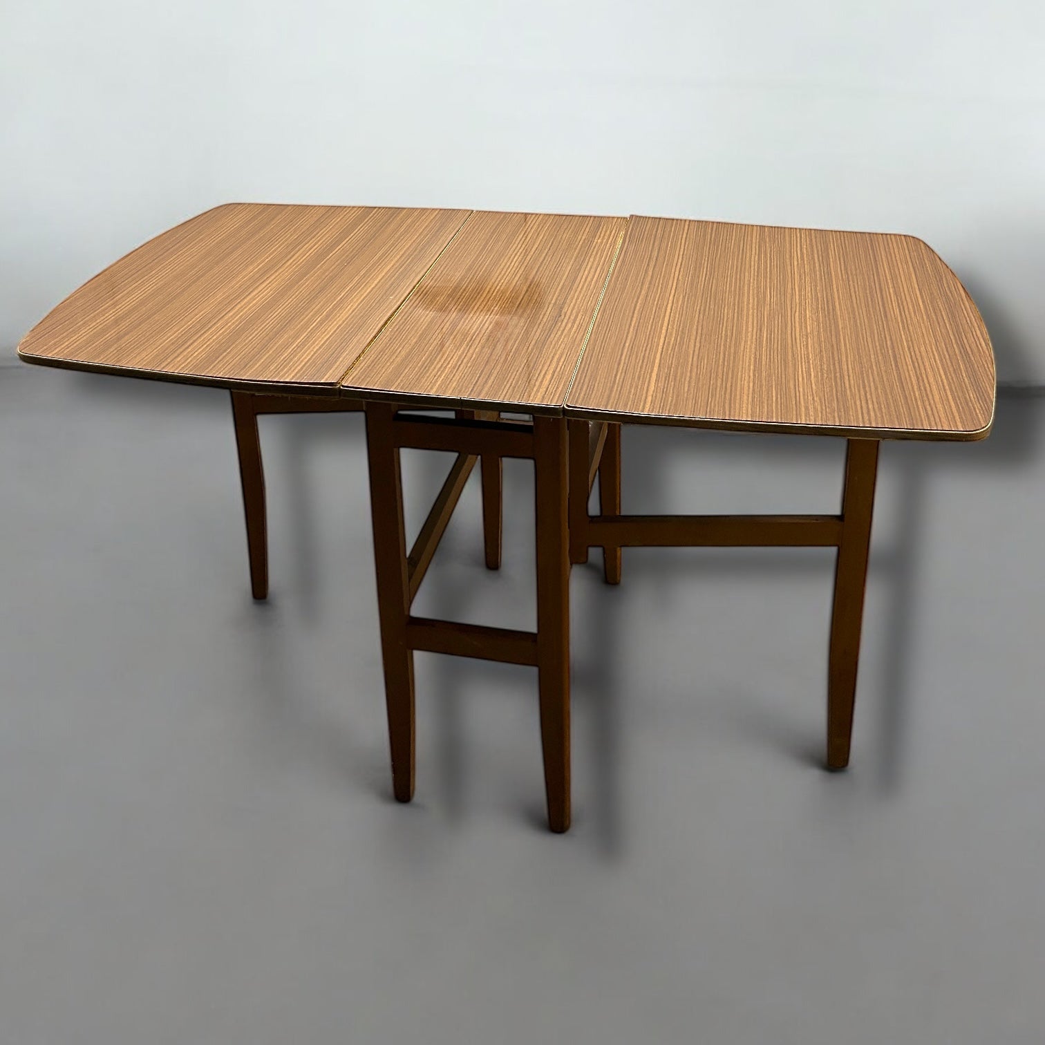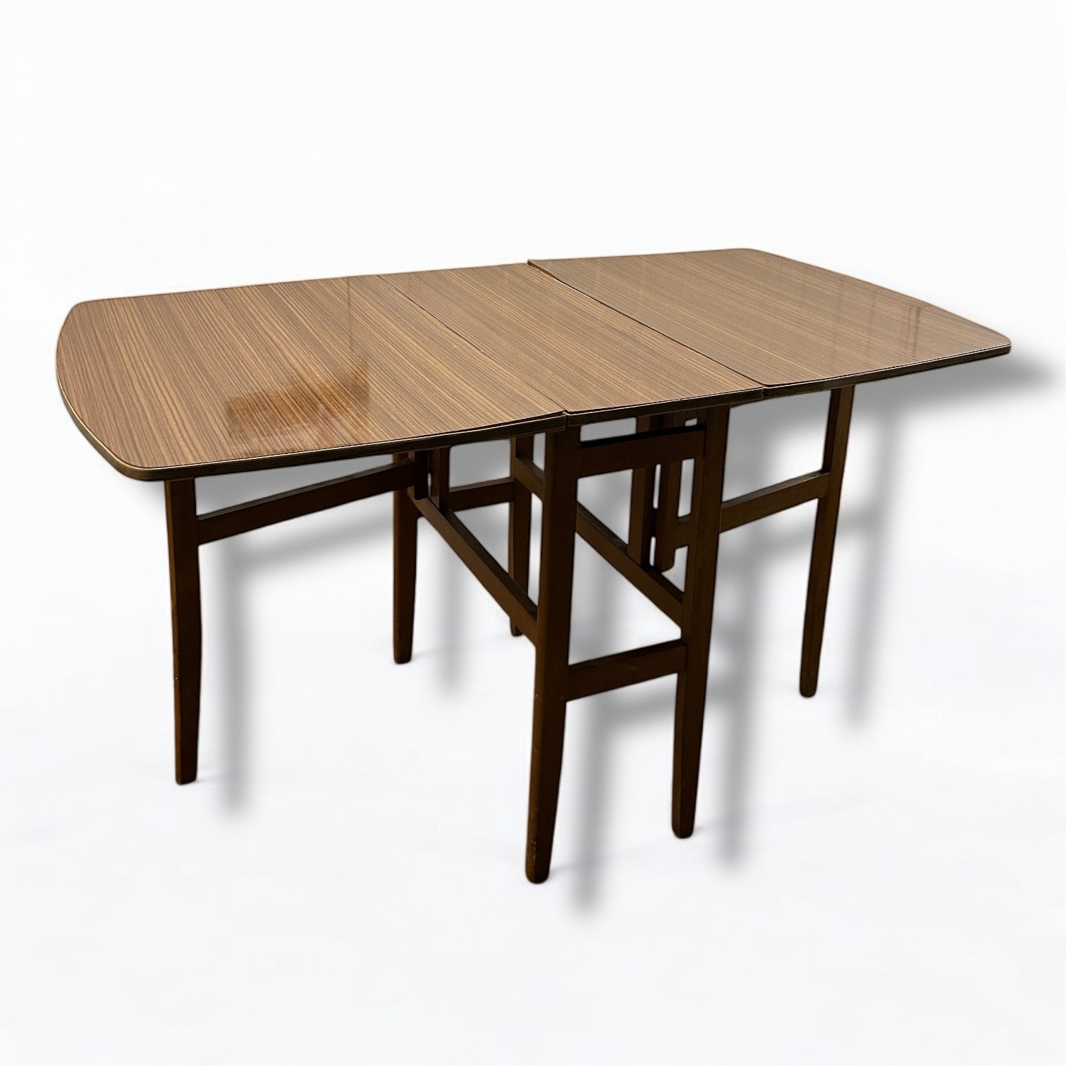 This vintage Formica dining table boasts two folding sides and a sturdy design. Despite its age and usage, it remains in nice, clean condition with only minor marks and scuffs. Enjoy its hardwearing qualities and timeless style.