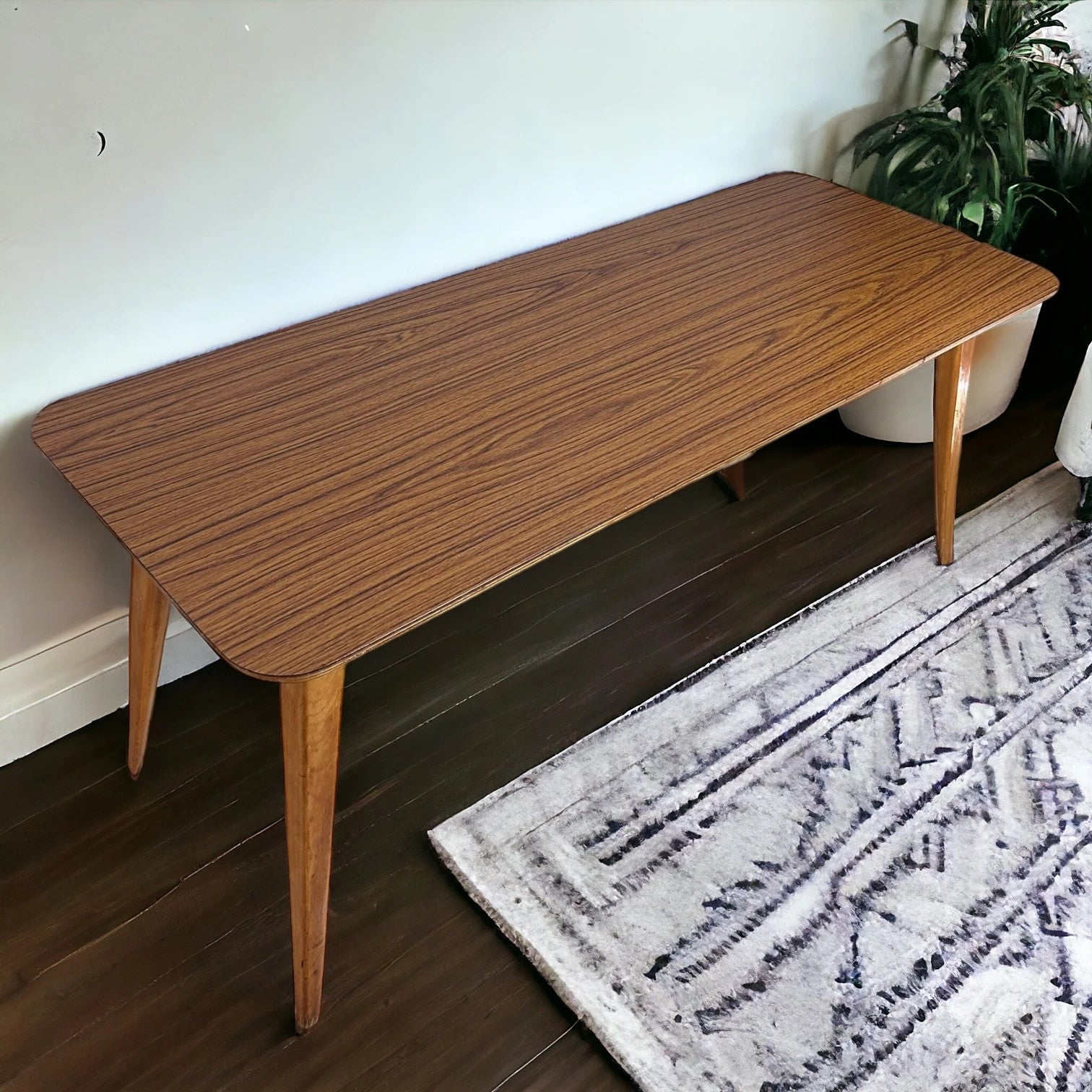 Add a touch of retro flair to your living space with our Mid Century Formica Maple Coffee Table. Featuring a sleek design and durable construction, this table is perfect for enjoying your morning coffee or entertaining guests. Elevate your home decor with this unique piece!