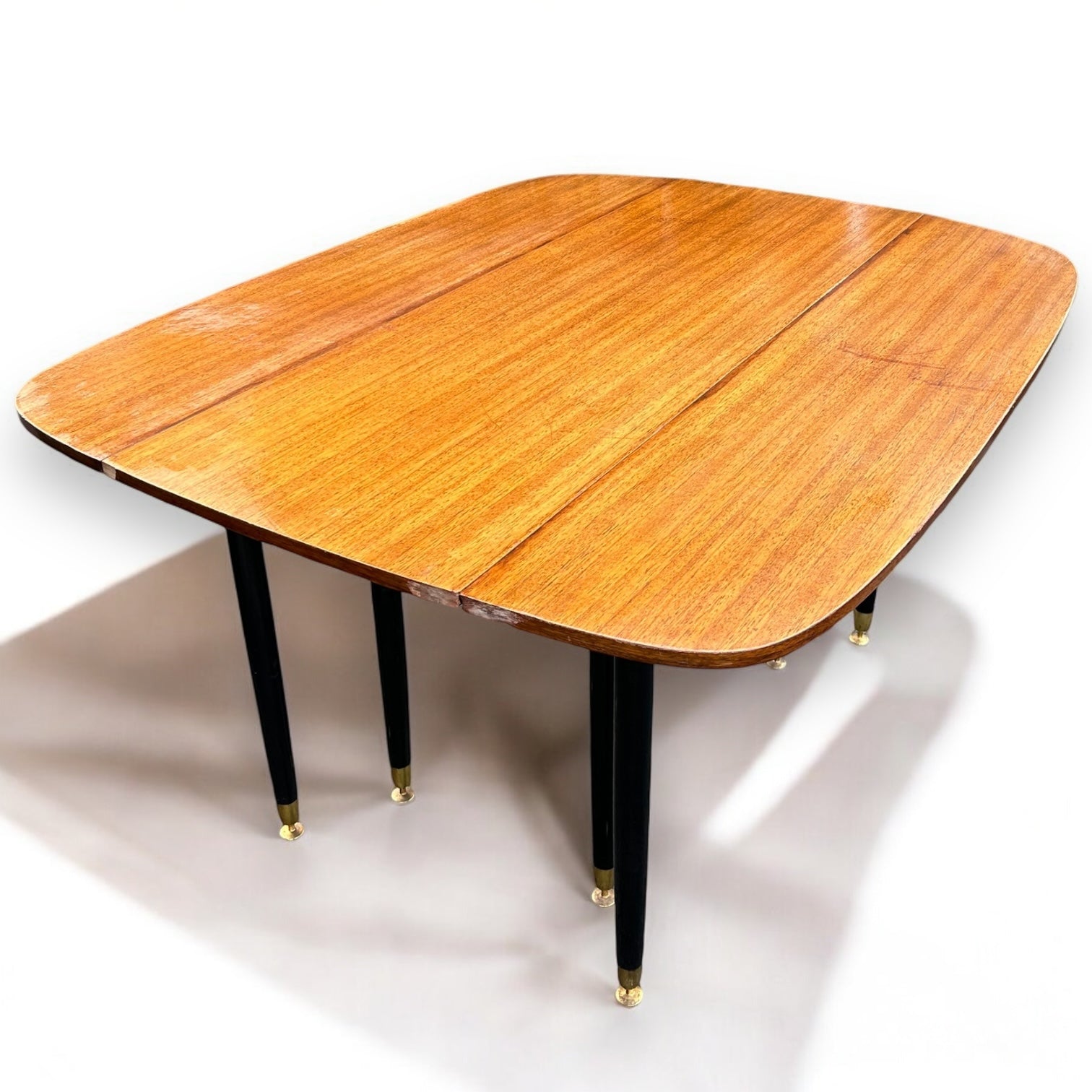 A striking example of mid century E Gomme, G plan dining furniture. Dated 1959 the elegant combination of black, gold and dark wood encapsulates the signature style typical of 1950's MCM design.