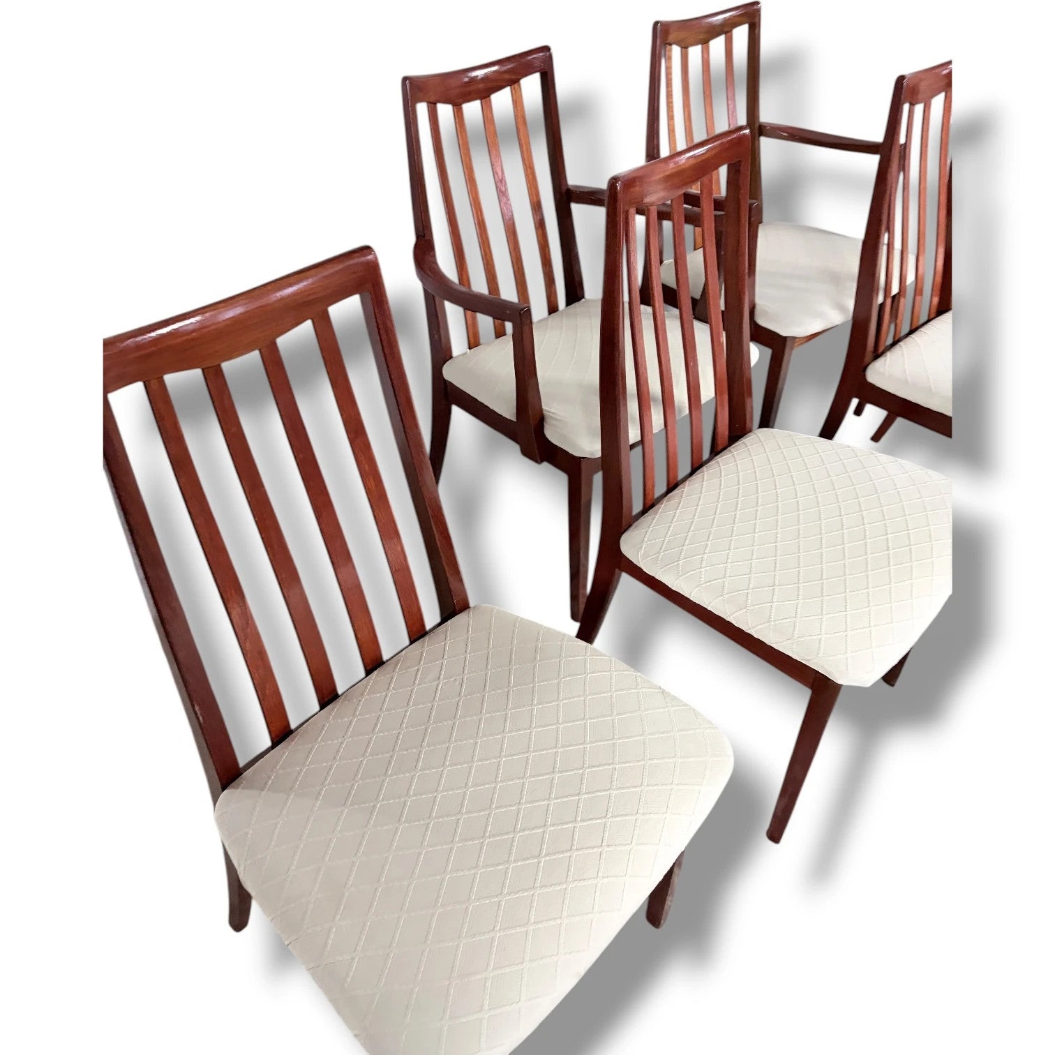 This set of mid century dining chairs by G Plan offers a perfect blend of style, comfort, and durability for your dining or boardroom space. Crafted from solid mahogany, these vintage dining seats feature elegant high back chairs that provide excellent support and add a striking retro style to any room. The light upholstered seats contrast beautifully with the warm wood furniture finish, creating comfortable dining seating that complements both classic mid century chairs and modern interiors.