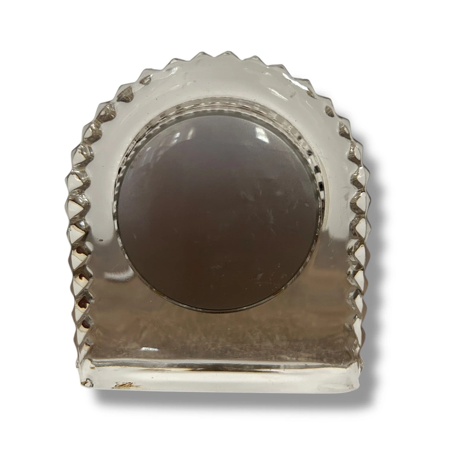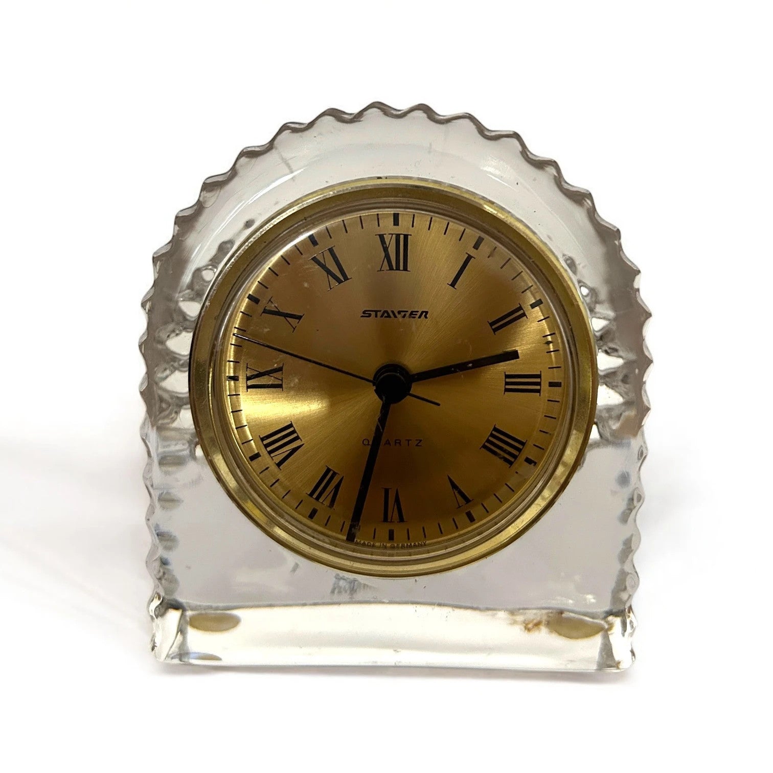 Vintage glass block analog electronic quartz clock. Heavy, solid glass slab with brass faced analog clock insert. Electronic quartz movement made in Germany with second hand tick. Battery operated (requires AA)
