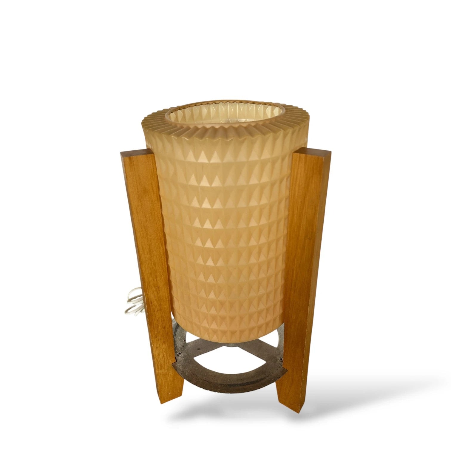 A stylish mid century rocket lamp with a sculptural wooden tripod frame and textured geometric shade. This vintage atomic-style lamp brings warmth and character to any room — ideal as a bedside lamp, sideboard accent, or statement lighting piece.